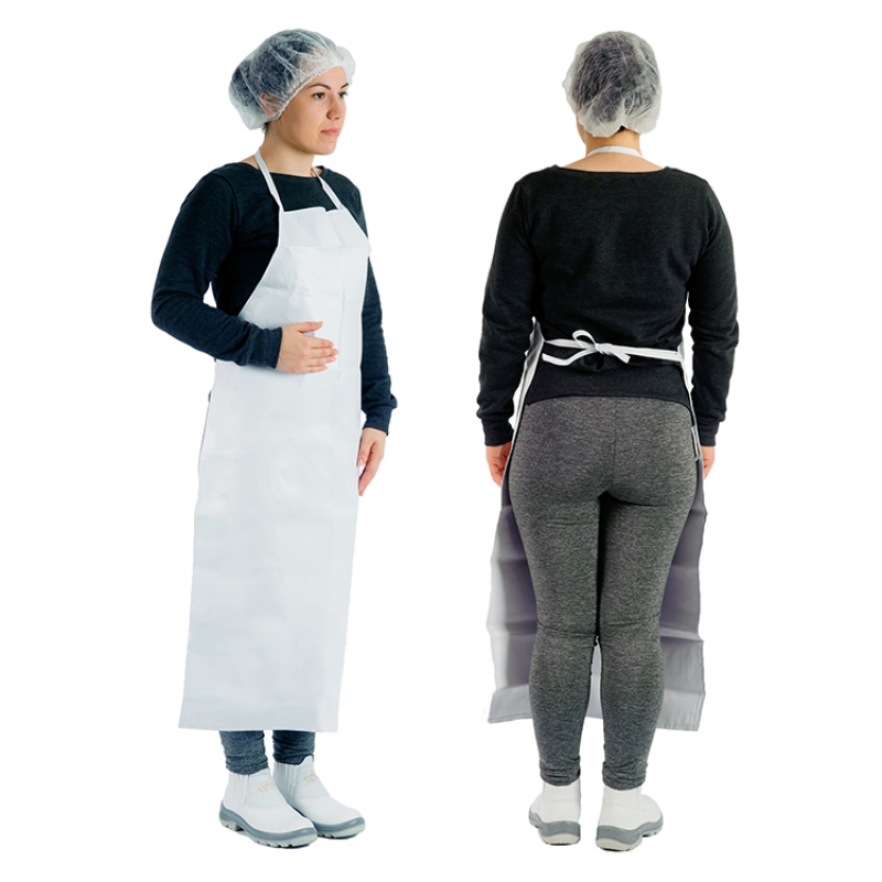 Avental de segurança confeccionado em tecido sintético, revestido de PVC, sem componentes metálicos.
