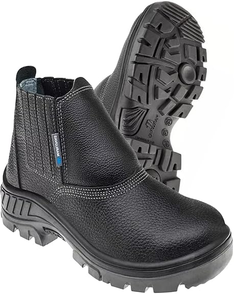 Calçado de segurança tipo botina, fechamento em elástico, confeccionado em couro curtido ao cromo, forro da gáspea em não tecido, forro lateral em tecido, palmilha de montagem em não tecido resinado costurado pelo sistema strobel, palmilha interna removível, biqueira de aço, solado de poliuretano bidensidade injetado diretamente no cabedal, resistente à absorção de energia na região do salto e ao óleo combustível.