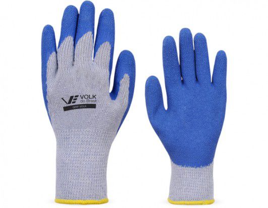 Luva de segurança confeccionada em malha com fibras sintéticas e naturais 10 gauge, revestimento em látex corrugado na face palmar dos dedos.